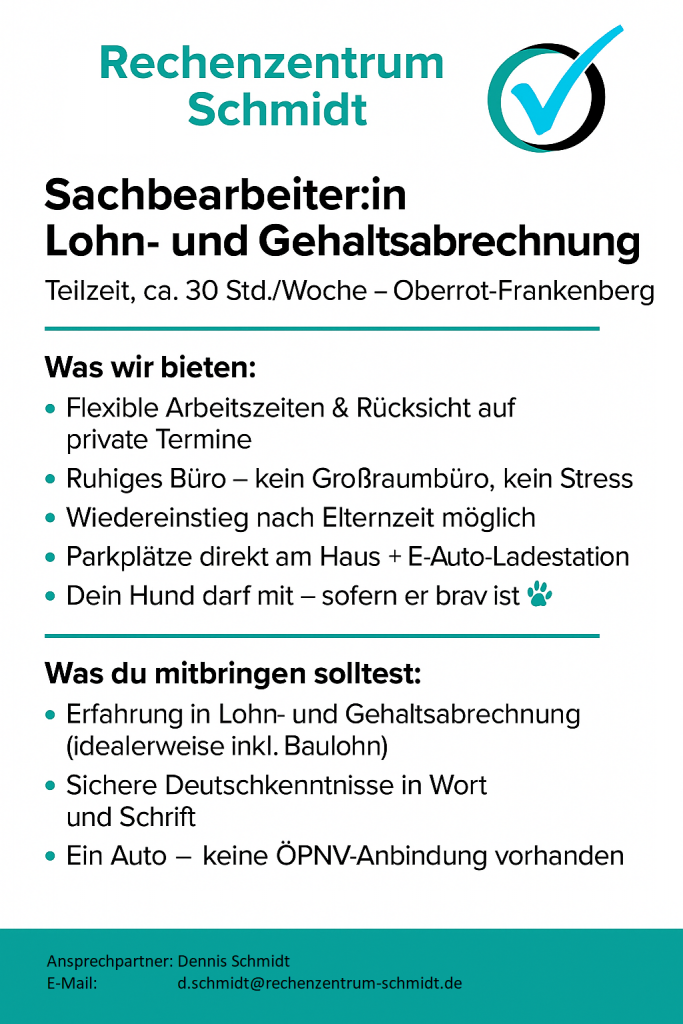 Wir sind ein kleines, spezialisiertes Lohnbüro aus 74420 Oberrot-Frankenberg. Mit über 30 Jahren Erfahrung erstellen wir zuverlässig und diskret Lohn- und Gehaltsabrechnungen für kleine und mittelständische Unternehmen.